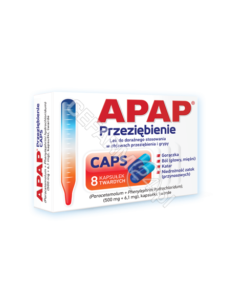 APAP Przeziębienie CAPS to lek w kapsułkach zwalczający nasilające się objawy przeziębienia i grypy: zmniejsza gorączkę, uśmierza ból głowy, bóle mięśni i bóle kostno-stawowe, udrażnia nos i likwiduje katar.Lek do doraźnego stosowania w objawach przeziębienia i grypy:gorączkaból (głowy, mięśni)katarniedrożność zatok przynosowych