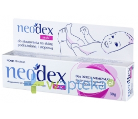 Maść Neodex dla dzieci i niemowląt, jest delikatnym, hipoalergicznym preparatem dla dzieci o działaniu ochronnym i natłuszczającym. Jest szczególnie zalecana do pielęgnacji skóry podrażnionej, popękanej oraz skóry atopowej i z podrażnieniami pieluszkowymi typu odparzenia. Maść Neodex dla dzieci i niemowląt, może być stosowana profilaktycznie w codziennej pielęgnacji skóry dziecka.