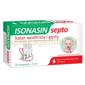 ISONASIN SEPTO katar wodnisty i gęsty to roztwór do płukania nosa stosowany przy przeziębieniach i zapaleniu śluzówki nosa i gardła. Zawiera kompleks upłynniający – chlorek sodu (obecny w wodzie morskiej, a w stężeniu 0,9% zwany jest solą fizjologiczną), tymianek znany ze swoich właściwości antybakteryjnych oraz jony miedzi pomagające usuwać bakterie oraz zapobiegać ich namnażaniu .Płukanie preparatem ISONASIN SEPTO pozwala na:zmniejszenie niedrożności nosausunięcie śluzu oraz czynników powodujących infekcjezmniejszenie objawów związanych z przeziębieniem - dzięki zawartości miedzi.Dzięki temu ISONASIN SEPTO pomaga usprawnić oddychanie i przyspiesza ustępowanie infekcji.
